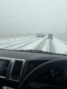 はい!前でトラックがスピンしてましたwノーマルタイヤの我がチームのトランポハイエース。流石に無理かとビビりまして、練習を断念引き返しました。この決断が前日練習を地獄にするとはまだこの時は知るよしもありませんでした。。。